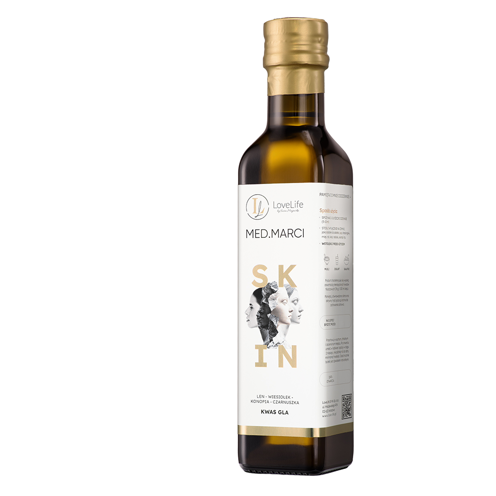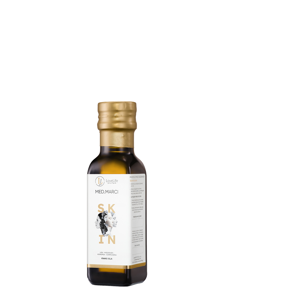 Jest naturalnym źródłem witamin rozpuszczalnych w tłuszczach, w tym witaminy E, nasz olej wspomaga regenerację skóry, wygładza jej powierzchnię i przyspiesza gojenie niedoskonałości. Regularne picie oleju SKIN pomaga regulować wydzielanie sebum, chroni przed nawrotami trądziku i wspiera prawidłową gospodarkę hormonalną, kluczową dla zdrowego wyglądu skóry.